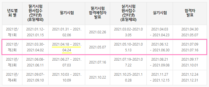 나는 두 과목 모두 동생이 쓰던 자습서로 공부를 시작해서 2019년 책으로 공부를 했는데, 아직까지는 예전껄로 공부를 해도 크게 차이는 없을 것 같았다. 큐넷 홈페이지에서도 2021년도까지의 출제기준이 동일해서(아래 사진 참고) 2019년, 20년 자습서를 보고 21년 시험을 쳐도 될것 같았다. 참고서는 매년 개정되어 나오기 때문에 만약 이미 책을 가지고 있다면 굳이 또 구매하지 않아도 된다는 것이 개인적인 생각.