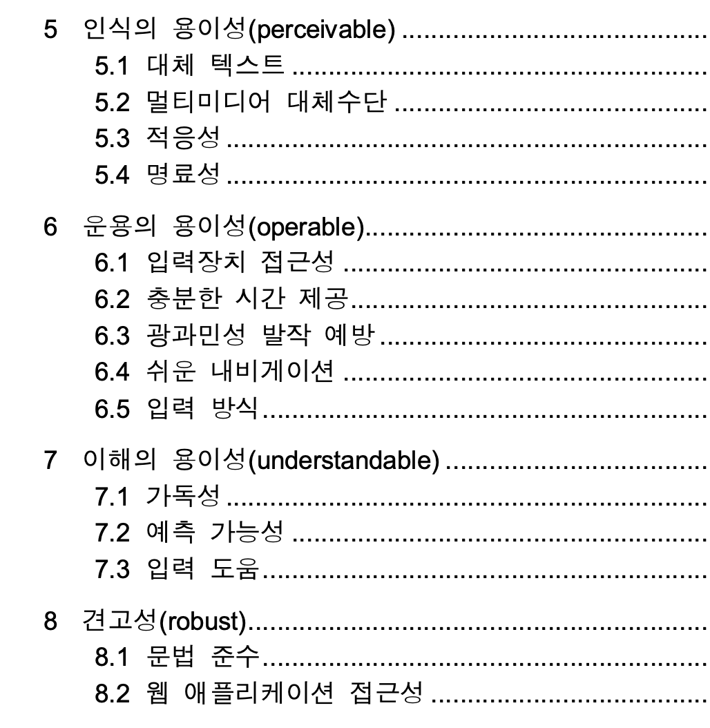 ์น ์ฝํ ์ธ ์ ๊ทผ์ฑ ์ง์นจ์๋ ์น ์ ๊ทผ์ฑ ์ ๊ณ ๋ฅผ ์ํ 4๊ฐ์ง ์์น๊ณผ ๊ฐ ์์น์ ์ค์ํ๊ธฐ ์ํ 14๊ฐ ์ง์นจ ๋ฐ ํด๋น ์ง์นจ์ ์ค์ ์ฌ๋ถ๋ฅผ ํ์ธํ๊ธฐ ์ํด 33๊ฐ์ ๊ฒ์ฌํญ๋ชฉ์ ์ ์ํ๊ณ ์๋ค.