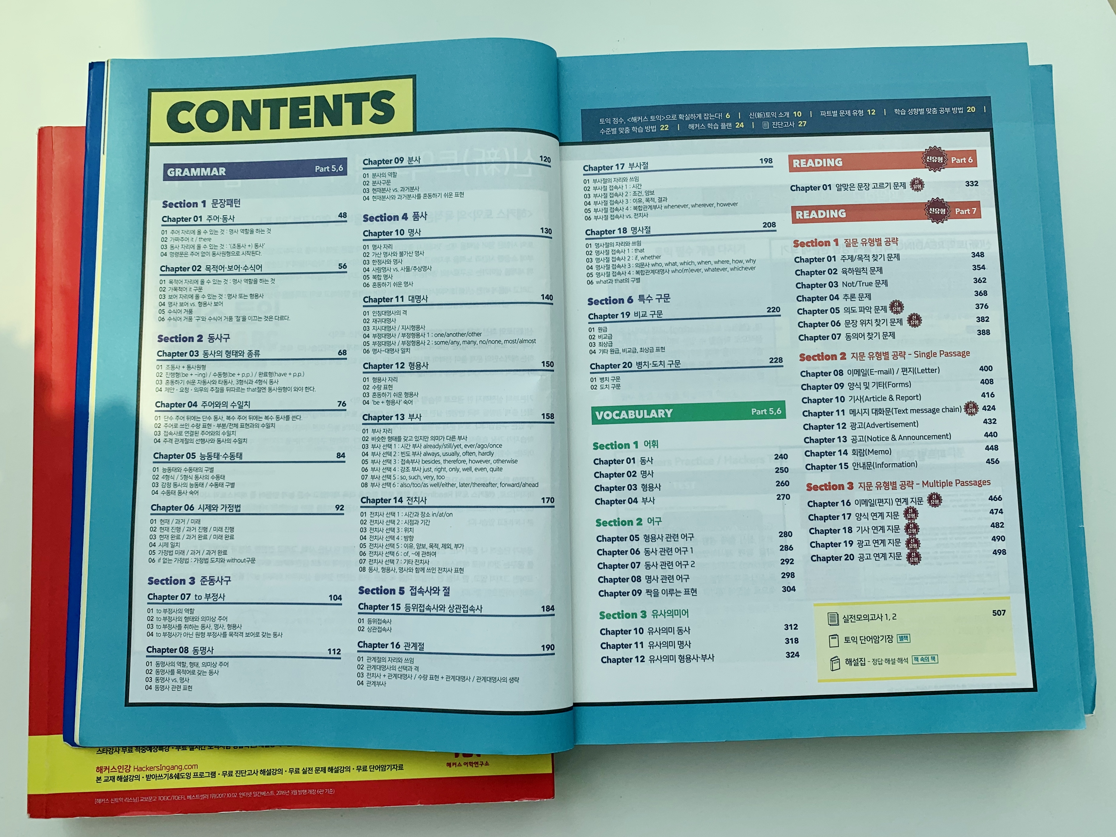 위 사진에서 보이는 것과 같이 [해커스 토익 리딩] 교재는 Part 5,6에서 중점적으로 다루는 문법 파트, 어휘 파트(일종의 단어장처럼 되어있다) 공부를 위한 구성이 있고, Part 7 Reading Part 를 위한 질문 유형별/지문 유형별 등의 설명과 문제 등으로 구성이 되어있었다.