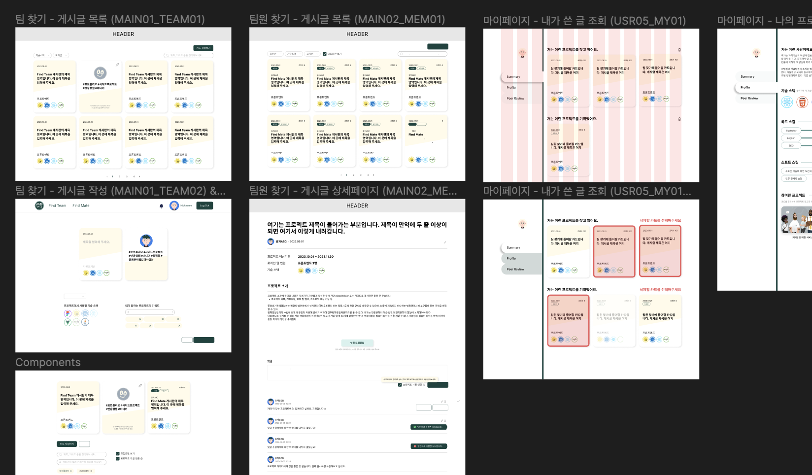 ๋กœ๊ทธ์ธ๊ณผ ํšŒ์›๊ฐ€์ž…์€ ์ธ์ฆ/์ธ๊ฐ€ ์ „๋ฐ˜์— ๊ฑธ์ณ์ง„ ์ž‘์—…์ด๋ผ ๋”ฐ๋กœ ๋บ๊ณ , auth๋ฅผ ๋‹ด๋‹นํ•˜๊ฒŒ ๋œ ์‚ฌ๋žŒ์ด ๊ฑฐ์˜ ๋ชจ๋“  ํŽ˜์ด์ง€์— ๋“ค์–ด๊ฐˆ Header์™€ Footer๋ฅผ ์ž‘์—…ํ•˜๊ธฐ๋กœ ํ–ˆ๋‹ค. ํŒ€์ฐพ๊ธฐ/ํŒ€์›์ฐพ๊ธฐ ๊ฒŒ์‹œํŒ์€ ์›น์‚ฌ์ดํŠธ์˜ ์ „์ฒด ๊ฒŒ์‹œํŒ์œผ๋กœ ๊ณตํ†ต๋œ ๋ถ€๋ถ„์ด ๋งŽ์•˜๊ธฐ ๋•Œ๋ฌธ์— ๋‚ด๊ฐ€ ํ•œ๋ฒˆ์— ๊ฐ€์ ธ๊ฐ„๋‹ค๊ณ  ํ–ˆ๋‹ค. ๋งˆ์ดํŽ˜์ด์ง€๋Š” ์ €๋ ‡๊ฒŒ ํ•˜๋‚˜๋งŒ ๋ณด์—ฌ์„œ ์–‘์ด ์ ์„๊ฑฐ๋ผ ์ƒ๊ฐ๋˜์ง€๋งŒ, ๋งˆ์ดํŽ˜์ด์ง€ ๋‚ด์—์„œ๋„ ํŽ˜์ด์ง€๊ฐ€ ๋ช‡ ๊ฐœ ๋‚˜๋ˆ„์–ด์ ธ ์žˆ์–ด ๋””์ž์ธ๊ณผ ๊ฐœ๋ฐœ ์ž‘์—…์„ ํ•  ๋ถ€๋ถ„์ด ์ ์ง€ ์•Š์•„ ํ•œ ์‚ฌ๋žŒ์ด ๋‹ด๋‹นํ•˜๊ธฐ๋กœ ํ–ˆ๋‹ค.
