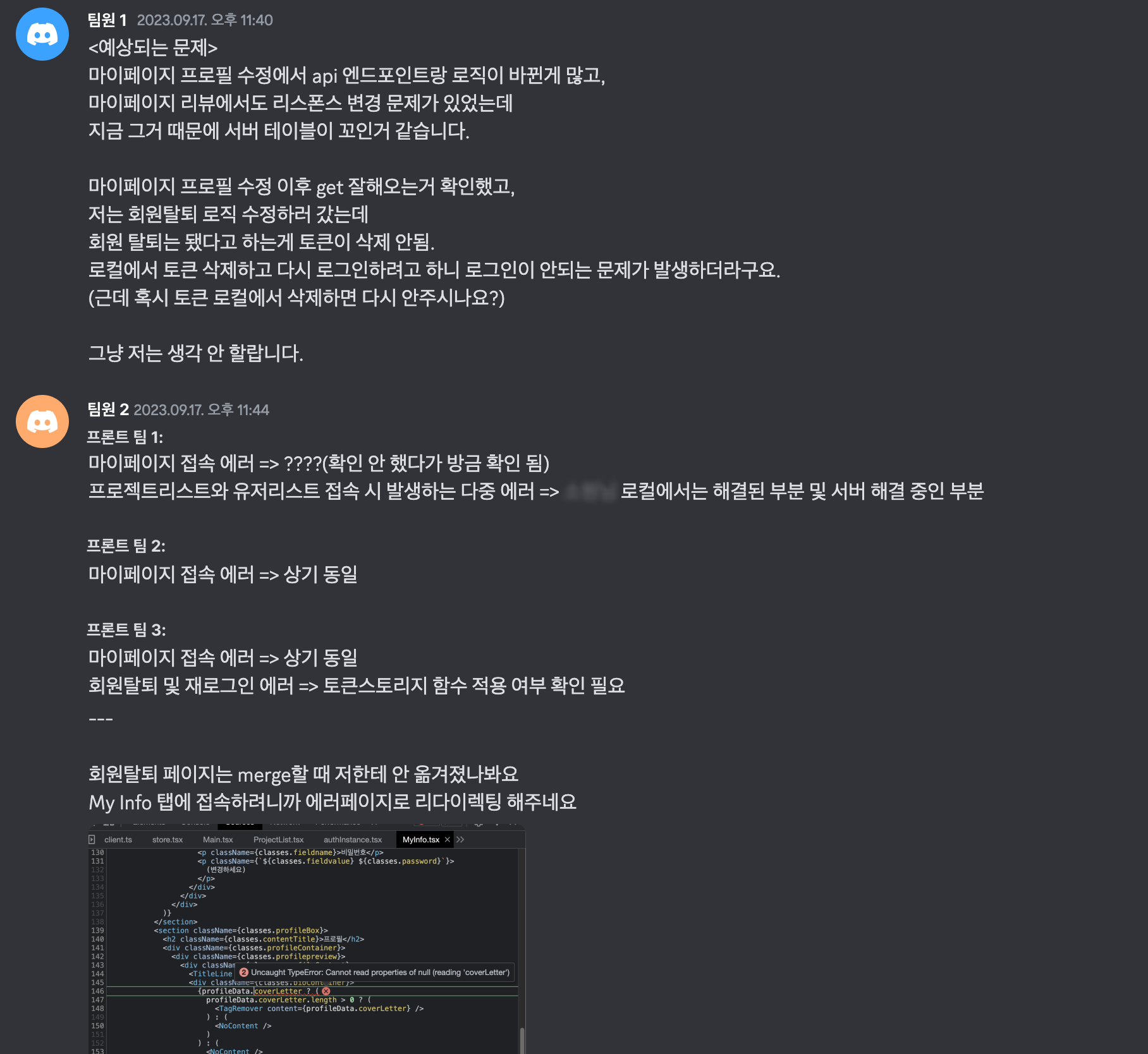 ๐ง ๋น์์๋ ๊ฐ์๊ธฐ ์ ๋๋ ์ฝ๋๊ฐ merge ํ์ ๋์ง ์๊ณ , ์ด๋ฐ์ ๋ฐ ๋ฌธ์ ์ํฉ์ ๋ถ๋ชํ์ ์ด๋ป๊ฒ ํด๊ฒฐํด์ผ ํ ์ง ์ํด๋ ๋ค. ์๋ฒ ์ชฝ ์ฝ๋์์ ๋ ์๋ฌ๋ ๋์งธ์น๊ณ , ์ด๋ฐ์ ํ๋ก ํธ ์ชฝ์ authInstance ๊ด๋ จํด์๋ ๋ ์๋ฌ๊ฐ ์์๋๋ฐ, ์ด ๋ถ๋ถ์ ๋ค๋ฅธ ํ๋ก ํธ ํ์์ด ์์ ํ๊ณ , ๋๋ axios intersepter(? instance?)๋ฅผ ์ฌ์ฉํด๋ณธ์ด ์์๊ธฐ ๋๋ฌธ์ ๋ฌด์์ด ๋ฌธ์ ์ธ์ง ์์ธกํ๊ธฐ๊ฐ ์ด๋ ค์ ๋ค. ๋ด๊ฐ ์์ ํ๋ ๋ถ๋ถ์๋ ํด๋น ์๋ฌ๊ฐ ์ํฅ์ ๋ฏธ์ณค๊ธฐ ๋๋ฌธ์ ์ฒ์์๋ ๋ฌด์์ด ๋ฌธ์ ์ธ์ง ์ดํด๋ณด๊ธฐ๋ ํ์๋๋ฐ, ์ ๋์ง ์์ ํด์ผํ ๋ค๋ฅธ ์์ ๋ ๋ง์์ ํด๋น ํ์๋ถ์ด ํด๊ฒฐ์ ํด์ฃผ๊ฒ ์ง, ๋ผ๋ ์๊ฐ์ผ๋ก ํ ๋ฐ ๋ค๋ก ๋ฌผ๋ฌ๋์์๋ ๊ฒ ๊ฐ๋ค. ์ฐ๋ฆฌ ํ๋ก ํธ ํ์๋ถ๋ ๋ฌธ์ ๊ฐ ๋ญ์ง ์ฐพ๊ธฐ ํ๋ค์ดํ๋ ๊ฒ ๊ฐ๊ธฐ๋ ํ์๋๋ฐ, ๊ฒฐ๊ตญ์ ํด๊ฒฐ์ ํ์๋ค. ๋น์์ ๋ด ์์ ํ๋๋ฐ๋ ๋ฐ๋น ์ ๋จ์ ์ฝ๋์์ ๋ ์๋ฌ๋ฅผ ๋ณผ ์ฌ์ ๊ฐ ์์๋๋ฐ, ์ง๊ธ ์๊ฐํด๋ณด๋ ๋์ ๊ทธ๋ฐ ๋์ฒ๊ฐ ์ฌ๋ฐ๋ฅธ ๋ฐฉํฅ์ด์์๊น, ๋ผ๋ ์๊ฐ์ด ๋ ๋ค. ์๋ฌ์ ์์ธ์ ๊ฒ์ํด์ ์ฐพ์๋ณด๋๋ฐ ์๊ฐ์ ์กฐ๊ธ๋ง ๋ ๋ค์๋๋ผ๋ฉด, ์กฐ๊ธ ๋ ๋ง์์ ์ฌ์ ๋ฅผ ๊ฐ์ก๋๋ผ๋ฉด, ์ข ๋ ํจ๊ป ์๊ฐํด ๋ดค๋๋ผ๋ฉด ์ด๋ผ๋ ์๊ฐ์ด ๋ค์๋ ๊ฒ ๊ฐ๋ค. ์๋ฒ ์ชฝ ์ฝ๋์์ ์๋ฌ๊ฐ ๋ฐ์ํ์ ๋์๋ ๋ง์ฐฌ๊ฐ์ง์๋ค. Java๋ก ์์ฑ๋ ์ฝ๋๋ฅผ ๋๋์ฑ ์ฝ์ ์๊ฐ ์์๊ธฐ ๋๋ฌธ์ ์๋ฌ๋ ๋ฌผ๋ก ์ด๊ณ ํด๊ฒฐ๋ฐฉ์๋ ์์ธกํ ์๊ฐ ์์๋ค. ํ์ง๋ง ํ์ด์ฌ์ ๊ณต๋ถํด๋ดค๋ ๋ค๋ฅธ ํ๋ก ํธ ํ์๋ถ์ด ์ด๋ฐ์ ๋ฐ ๋ฐฉํฅ์ผ๋ก ๋ฌด์์ด ๋ฌธ์ ์ผ๊น ์์ธกํ๊ณ , ์๊ฒฌ์ ๊ณต์ ํด์ฃผ๋ ๋ชจ์ต์ ๋ณด๋ฉด์ ๋ช๋ช ์๊ฐ์ด ๋ค์๋ ๊ฒ ๊ฐ๋ค. ๋ชจ๋ ๊ฑธ ๋ค ์ ์๋ ์๊ฒ ์ง๋ง, ์กฐ๊ธ๋ง ๋ ๋๊ฒ ๊ณต๋ถ๋ฅผ ํ๋ฉด ๋ค์ํ ์ํฉ์ ๋ํด ์กฐ๊ธ ๋ ์ ์ฐํ ๋์ฒ๊ฐ ๋ ๊ฒ ๊ฐ๋ค๋ ์๊ฐ๋ ๋ค์๋ค.