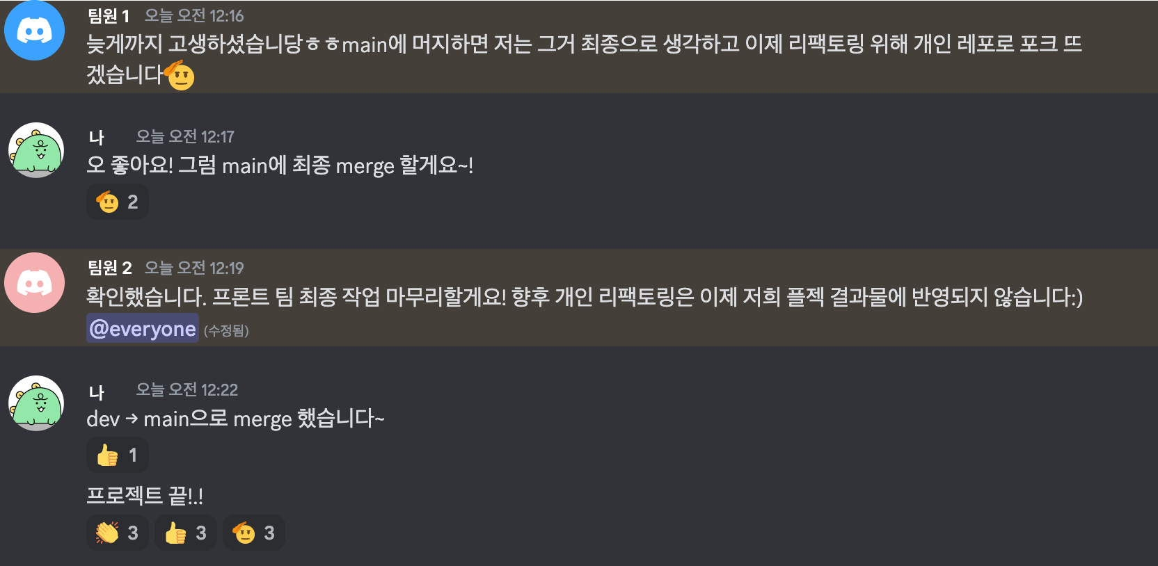 μ΄μ λΆν° μμ μ μνλ€λ©΄ κ°μΈ repositoryμμ κ°μ 리ν©ν λ§ λ±μ μμ μ νκΈ°λ‘ νλ€. λ§μ§λ§ mergeλ₯Ό νλ©° λ©μΈ νλ‘μ νΈκ° μ λ§ λμ΄κ΅¬λ, λΌλ μκ°μ΄ λ€μλ€. μμ§ Deme-Day μ μ΄μλλ°, λκ° νλ ¨νλ©΄μλ μμ¬μ΄ λ§μμ΄ λ€μλ€.