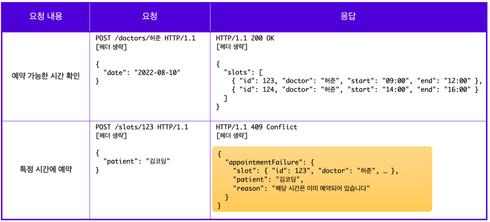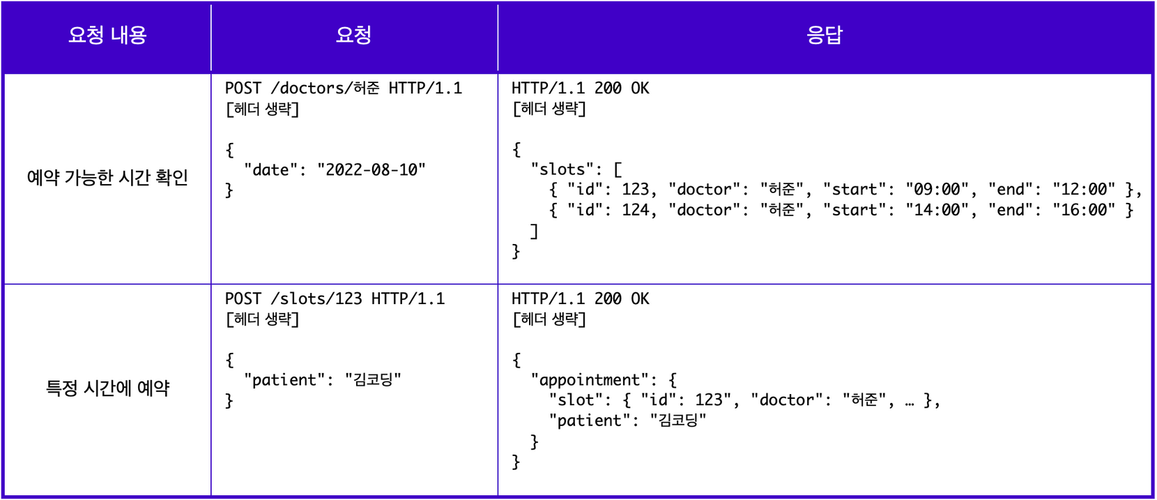 → 0단계 에서는 요청에서의 엔드포인트로 모두 /appointment를 사용하였지만 1단계에서는 요청하는 리소스가 무엇인지에 따라 각기 다른 엔드포인트로 구분하여 사용한다.