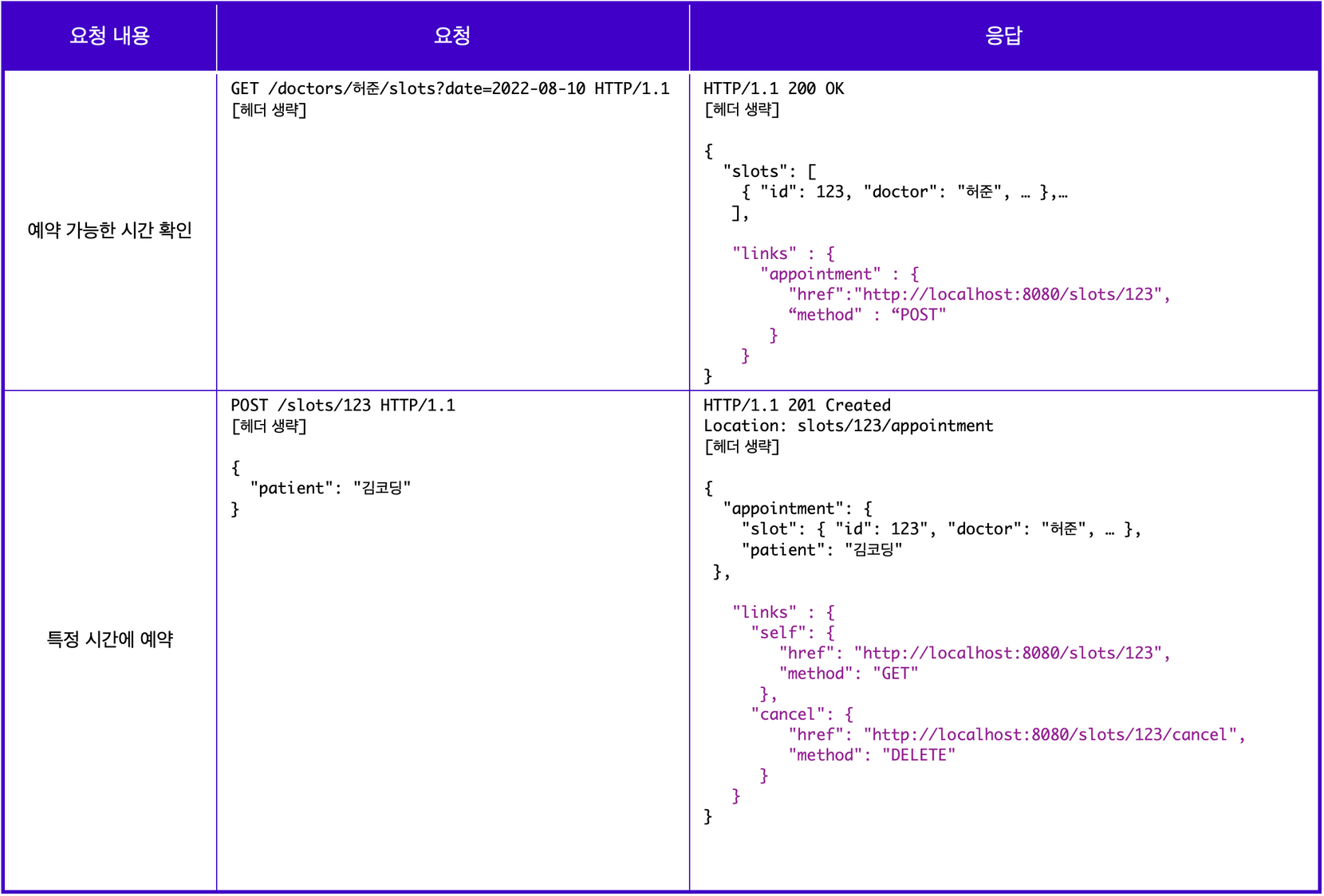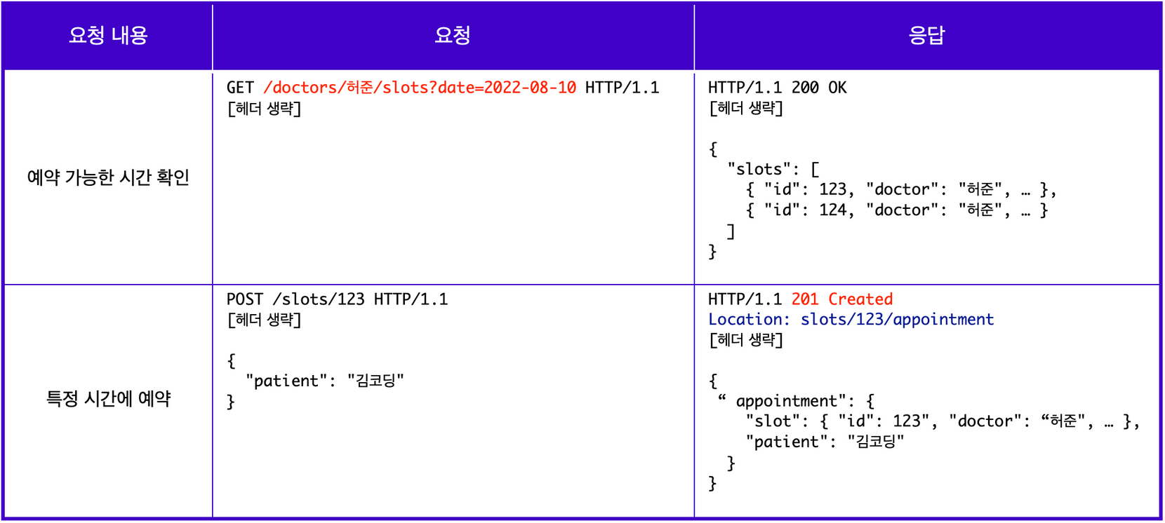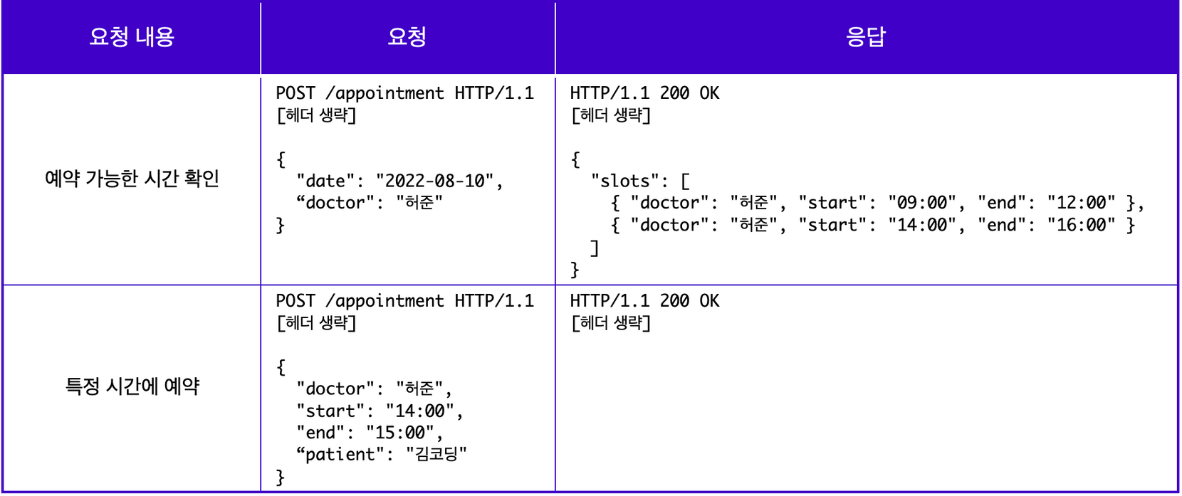 → 0단계 에서는 요청에서의 엔드포인트로 모두 /appointment를 사용하였지만 1단계에서는 요청하는 리소스가 무엇인지에 따라 각기 다른 엔드포인트로 구분하여 사용한다.