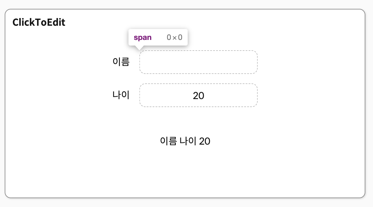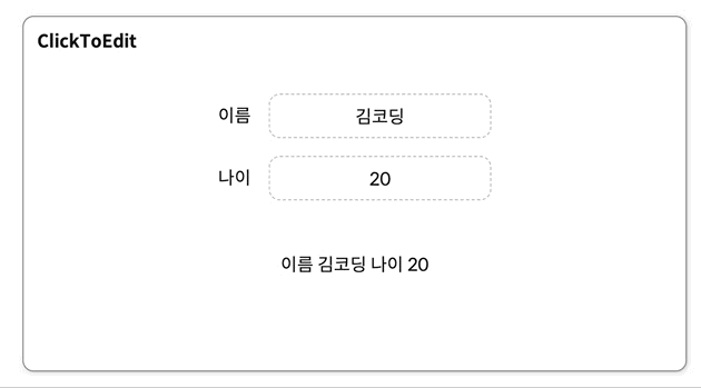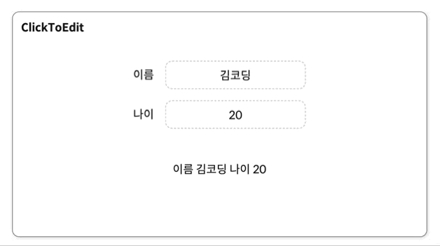 ClickToEdit ์ปดํฌ๋ํธ๋ input ์ฐฝ์ ํด๋ฆญํ๋ฉด ์์ ์ด ๊ฐ๋ฅํ๊ณ , input ์ฐฝ์ด ์๋ ๋ค๋ฅธ ๊ณณ์ ํด๋ฆญํ๋ฉด ์์ ํ ๋ด์ฉ์ด ๋ฐ์๋๋ ๊ธฐ๋ฅ์ ๊ฐ์ง ์ปดํฌ๋ํธ์ด๋ค.