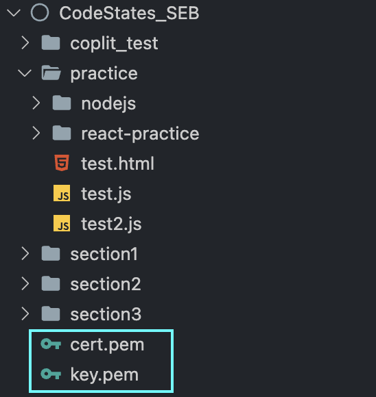 💬 CodeStates의 앞으로의 학습에서도 cert.pem과 key.pem이 사용된다고 해서 상위폴더에 파일을 생성하고, 경로지정을 위해 path.join을 사용했다.