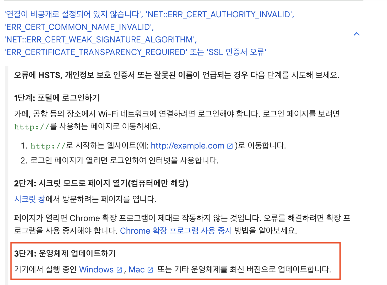 mkcert를 삭제했다가 다시 설치도 해보고, 파일 전부를 삭제하기도 해보고, 브라우저를 껐다 켜보기도 하고, 캐시도 삭제해보고, 시크릿 모드로도 들어가보고, 시간을 좀 두고 쉬다가 작업을 해보기도 했는데 해결이 되지 않아서 chrome 브라우저 에러 창에서 연결 오류 해결을 눌러서 도움말을 확인해봤었다.